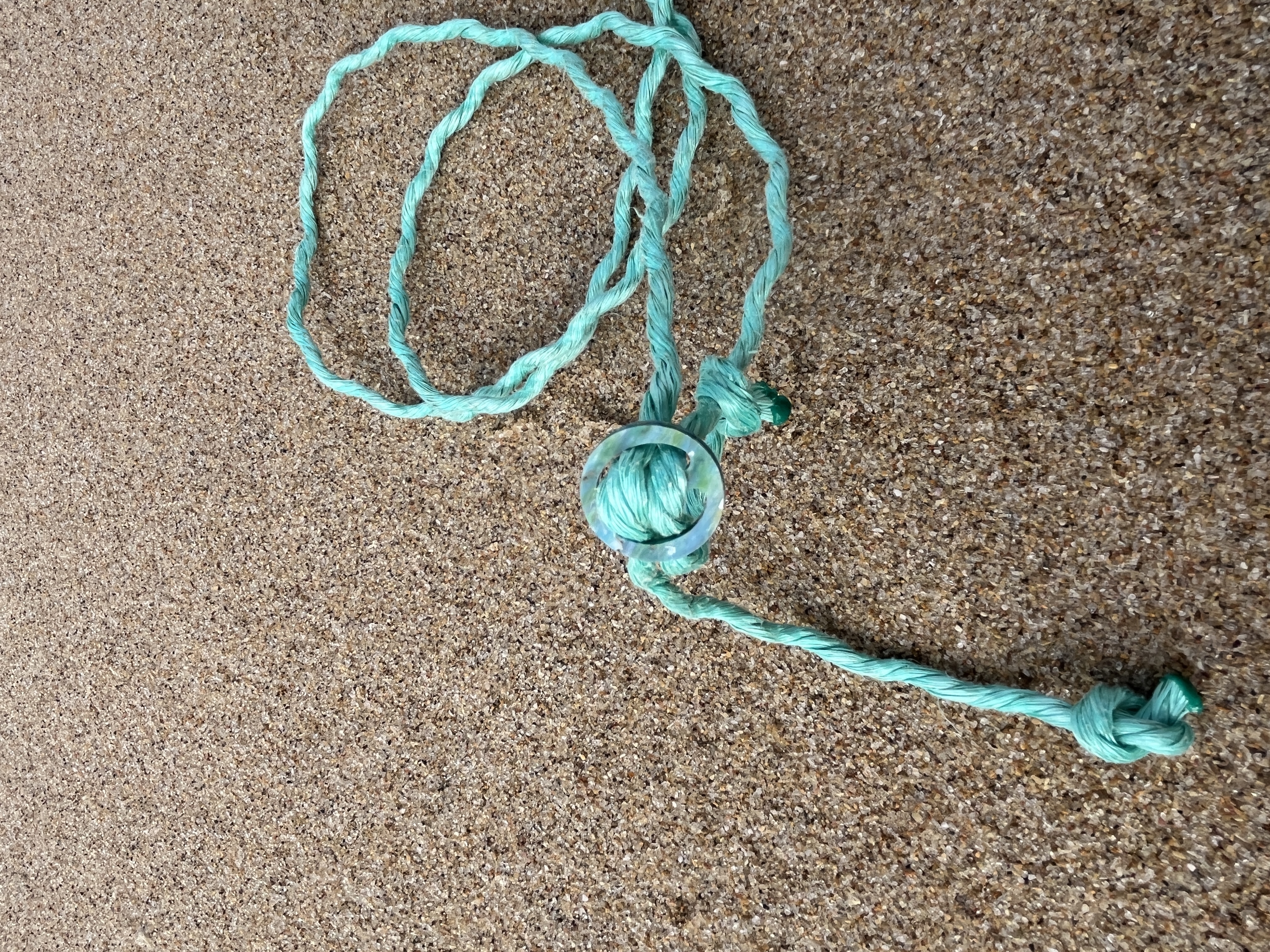 • Kordel aus alten Fischernetzen, gefunden in Portugal (wurden gewaschen, können dennoch minimale Reste aus dem Meer enthalten (Algen), da sie schon sehr lange im Wasser waren); die Enden der Kordel wurden erhitzt, damit der Knoten sich nicht löst, somit sind sie etwas kräftiger grün als die restliche Kordel